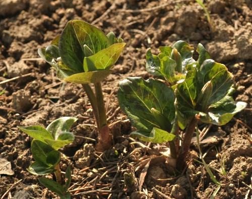 Hurra, die zwei Trillium vaseyi-Knöllchen, die ich letztes Frühjahr gesetzt habe, schieben jetzt zum ersten Mal je ein Blättchen. Auch zwei von den letztes Jahr gepflanzten 3 Trillium grandiflorum bekommen jetzt ein erstes Blatt. Blühen werden sie dieses Jahr ja sicher noch nicht, aber ich bin schon glücklich über die Blätter.
