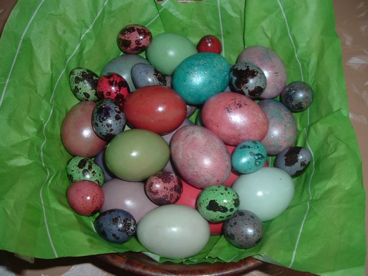 Ich wünsche ebenfalls allen, die hier unterwegs sind, schöne Feiertage und würde mich freuen, wenn ihr auch noch daran denkt, was der eigentliche Sinn dieses Festes ist.Hier ein Foto unserer selbstgefärbten Ostereier von den eigenen Hühnern und Wachteln.