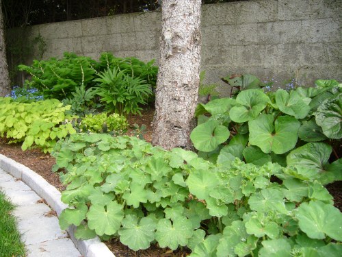 Aber ich habe dort einen Tröpfchenbewässerungsschlauch verlegt, den ich allerdings heuer noch nicht aufgedreht hatte, obwohl wir die letzten 2 Wochen überhaupt keinen Niederschlag hatten (die Fotos sind trotzdem ganz aktuell - heute extra gemacht). Ich drehe ihn auch sonst nur an heißen Tagen im Sommer für eine Weile auf. Aber ich denke, dass eine zusätzlich Bewässerung auf solchen Standorten sehr empfehlenswert ist!Die gesamte Bepflanzung stammt aus dem Sommer 2003, sie war aber auch voriges Jahr schon sehr dicht. An die Mauer, die man im Hintergrund erkennen kann, habe ich im Herbst übrigens 3 Stück Clematis montana 'Freda' gepflanzt (Kletterhilfe wird morgen installiert). Wachsen tun sie schon brav, haben allerdings nur eine Knospe. Jetzt hoffe ich nur, dass es ihnen dort nicht zu dunkel ist. Sie bekommen am Tag ca. 1 - 2 Stunden Sonne. Ach ja, noch was: wir überlegen übrigens, ob wir die Tannen nächstes Jahr nicht ganz entfernen und durch Laubbäume ersetzen, weil sie einfach nicht mehr schön sind. Das war auch der Grund, warum wir sie aufgeastet haben, weil sie sind innen drin schon ganz braun. Mit ein Grund, warum ich Nadelbäume eigentlich üüüüüüüberhaupt nicht mag. Nur wird das Nachpflanzen evtl. ein Problem, weil ich keine Ahnung habe, wie wir den Wurzelstock rausbekommen sollen!