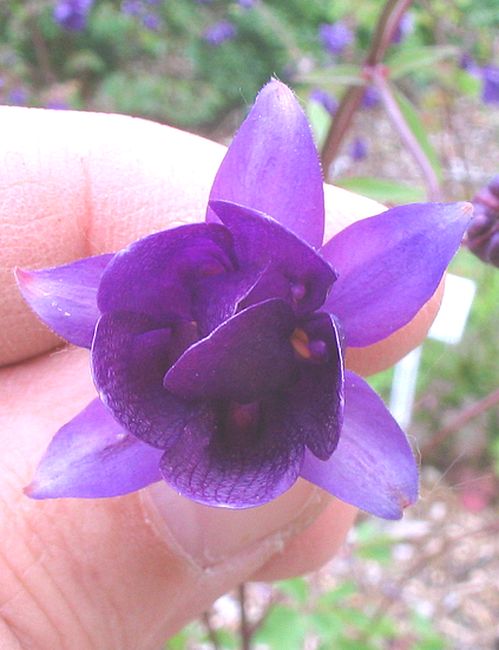 Dieser Name ist nicht mehr zulässig. Aktuell ist Aquilegia ecalcarata, die aus China stammt. Soweit ich im Internet erahren konnte, hybridisiert sie nicht mit Akelei. Ich habe Zweifel, wie die nachfolgen Aufnahmen zeigenBild 1 zeigt A. ecalcarata, die lediglich ca. 30 cm hoch wird und deren blüten eine Burgunderfarbe hat. Bei den Petalen zählt man nur 5.