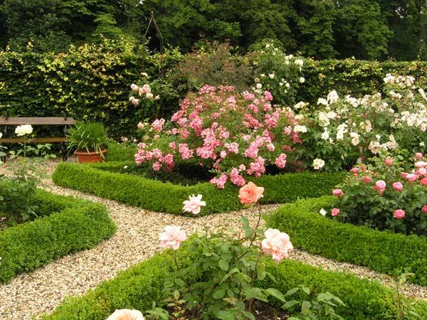 Das Rosarium mit buxgesäumten Quartieren, topgesunde und gepflegte Rosen wachsen hier. Die Buxhecken werden von Hand geschnitten