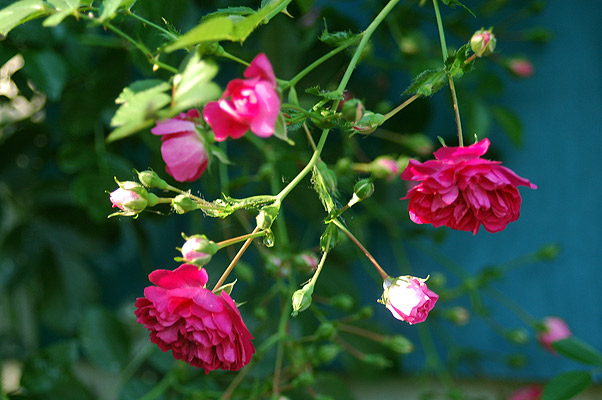 Diese Rose habe ich über viele Jahre hinweg abgemäht, weil sie - so klein wie sie war - einfach nicht erkennbar war. Irgendwann entstand dort ein Beet, und sie entpuppte sich als riesiger Rambler ( bis Dachrinne ). Sie stand schon auf dem Grundstück. Möglich ist aber auch ein Sämling. Sie blüht sehr reich, ist allerdings mehltauempfindlich. Sie hat ganz dünne, weiche Triebe.Kennt sie vielleicht jemand?