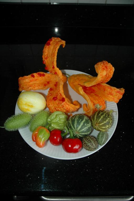 . Nicht alle essbar, dafür ziemlich bunt. Meine Olivengürkchen haben einen tropischen Blätterwald gemacht und kein einziges Früchtchen, was hab ich da wohl falsch gemacht? Auf dem Teller liegen Balsambirne, hinten. Zitronengurke rechts, verschiedene Ziergürkchen, "Knitterchili's", Peperonico's rot, und Duftmelonen. Hab flink durchgeforstet, damit wieder Licht in's Dunkel kommt und dabei mein einziges nun endlich 5 cm grosses Drachenei gekillt! Brüll!!!!! Ja,ja, verschlimmbessern
