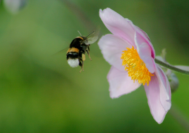 Ich mache es genauso wie Thomas. Suche mir eine frequentierte Blüte aus ;) und verharre mit meinem Stativ in Lauerstellung. Genügend Licht muss vorhanden sein, sonst wird das nix. Ich habe etliche Hummeln im Flug erwischt, aber der Rest ist leider ziemlich unscharf. Ich habe den Eindruck, dass Hummeln etwas langsamer fliegen (besonders die großen Brummer) und nicht so nervös sind wie Bienen. Die Daten:Autofocus, F/5,6, 1/500 Sek., Brennweite 200Meine Hummel sieht bei weitem nicht so dynamisch aus wie die von Gartenlady, aber sie fliegt dennoch ;D