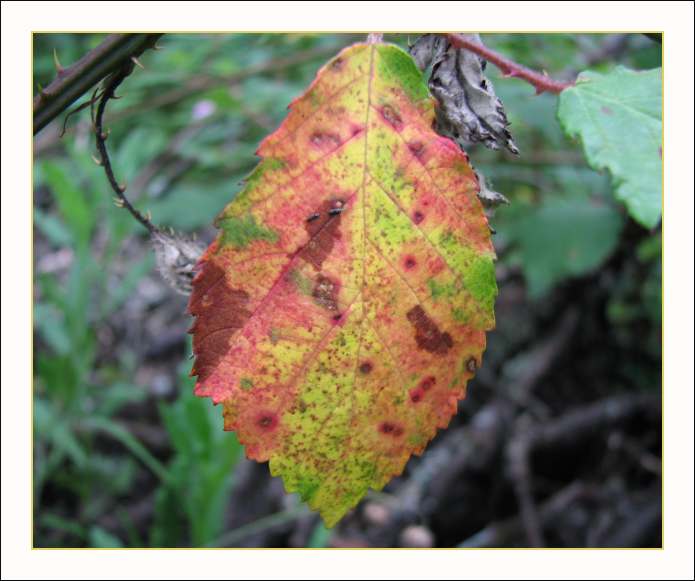 Eine ganz eigene Faszination üben bunte Blätter auf mich aus. Sie sind mir deshalb immer ein willkommenes Fotoobjekt. Es war eigentlich schon viel zu dunkel und ich habe ohne Blitzlicht gearbeitet.Blatt 1