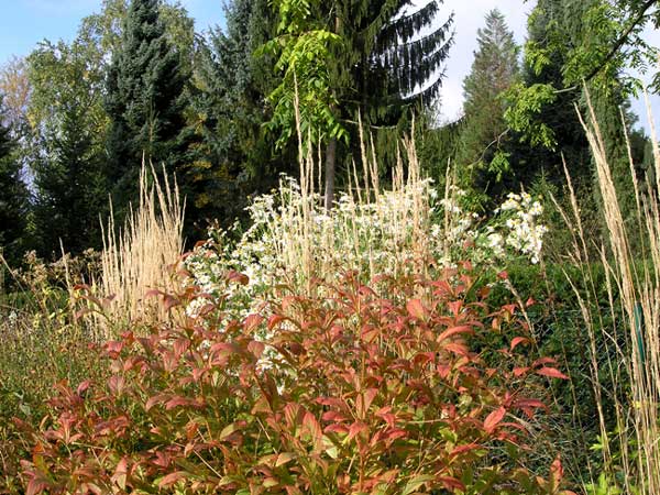 Hier färbt sich Gillenia trifoliata wunderschön, im Hintergrund Boltonia ´Snowbank´ die Gräser sind Calamagrostis acutiloba ´Overdam´. Ausschnitt aus dem weißen Beet im Boga.