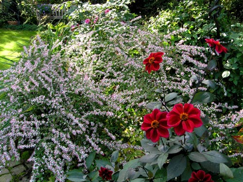 Die Aster horizontalis ´Lady in Black´ deckt alles zu, was im Frühsommer schön war und jetzt nicht mehr so toll aussieht. Dies ist nur eine Pflanze, Nachbar ist die Dahlie ´Mount Noddy´.