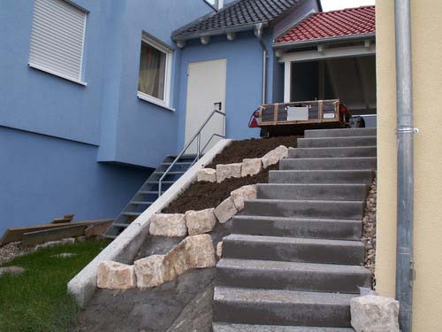 Das hat übrigens eine Gartenbaufirma gemacht. Die Muttererde liegt bereits im Garten bereit. Wir möchten auf jeden Fall bis zur Kante der Stützmauer bzw. der Treppe auffüllen. Es wäre also dann schon eine Schicht Erde vorhanden. Ob man vor dem Aufbringen der Muttererde von dem Schutt was abtragen kann, bin ich mir nicht sicher. Nicht dass die Treppe abrutscht