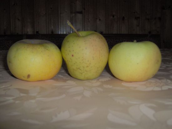 Ich vermute auch, daß es ein Boskop ist, sicher bin ich ebenfalls nicht, aber ziemlich.Darf ich mich hier vielleicht anhängen, damit ich keinen neuen Thread mit demselben Thema eröffnen muß (wollte das gerade tun). Ich habe nämlich auch Äpfel, von denen ich nicht weiß, um welche Sorte es sich handelt. Sie sehen den Golden Delicious ähnlich, aber doch ein bisschen anders. Schmecken tun sie auch etwa so, aber doch nicht ganz. Das in der Mitte ist ein Golden Delicious.