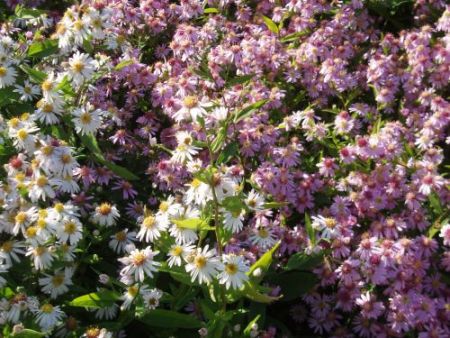 Astern ist kein abgedroschenes Thema! Viele alte Sorten tauchen auf, aber auch manche Neuheit ist interessant und gartenwürdig. Kommt darauf an, was man daraus macht. Nicht wenigen sind die gestauchten Aster novi-belgii in Erinnerung, die CC-Wagen-gerecht in den Gartencentern landen. Darum ist auch manchen von uns der Einkauf von schön blühenden Astern verleidet, weil sich dann im kommenden Jahr ein Monster daraus entwickelte.Hier zu Beginn zwei ältere Sorten, die ich vor zwei Jahren in Kultur nahm.Links im Bild Aster 'Chloe', eine sehr hübsche A.-lateriflorus-Hybride, die A.novi-belgii- Blut in sich trägt. Rechts die Sorte 'Coombe Fishacre', wahrscheinlich aus demselben Hybridschwarm.