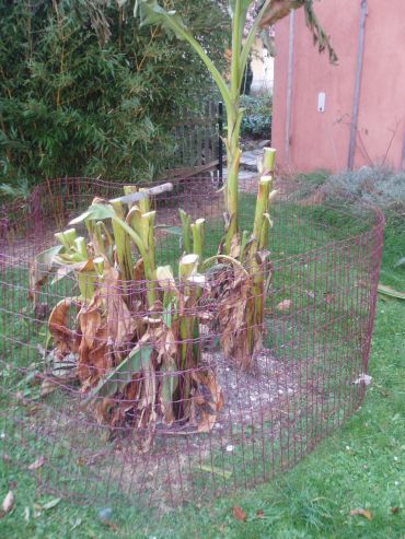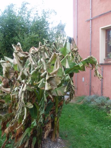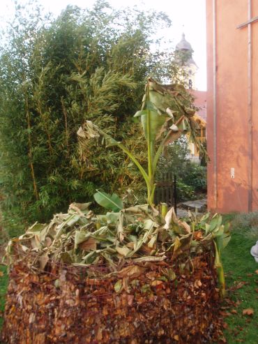 Hallo,in den nächsten Tagen wird es hier auch nachts mal -5 oder so rum haben, also Zeit, jetzt die Banane winterfest zu machen - der Dauerwind gestern hat sie schon ganz schön gebeutelt:
