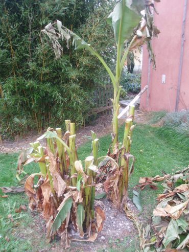 ... und im kommenden Frühjahr dokumentiere ich die Entlaubungsaktion, sowie den beginnenden Austrieb. Es ist jedes Jahr spannend, wie sich unsere Banane entwickelt. Gedüngt wird sie mit flüssigem Schweinemist und einer gehörigen Portion Nitrophoska. Und viiiieeeel Wasser!