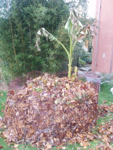 Dann können schubkarrenweise Laub herangekarrt werden. In diesem Fall handelt es sich um Ahorn- und Buchenlaub. Insgesamt sind es 9 Schubkarren Laub geworden. Es sitzt mit der Zeit etwas zusammen, dies tut aber der Banane nichts.