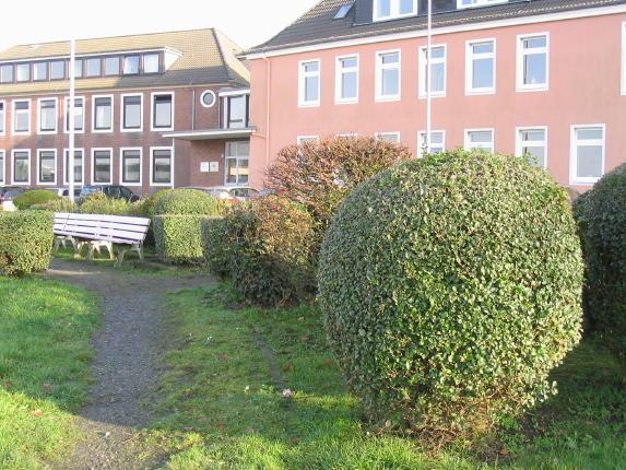 Und die ebenso gestaltete Umgebung. Die Birke ist hinter der Ligusterkugel zu sehen. Man beachte, dies ist eine oeffentliche Anlage! Sehr schmal, eigentlich nur ein Weg mit einseitiger Randbepflanzung. Fuer den Zweck finde ich die gewaehlte Loesung passend und originell. Der Kuenstler ist leider mittlerweile pensioniert, die Firma, die das jetzt macht, arbeitet nicht mehr ganz so akkurat.