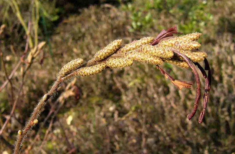..und hier mal ein nicht gerade auffallendes, aber dennoch interessantes und selten kultiviertes Gehölz: Comptonia peregrina, hier mit männlichen Kätzchen. Die nordamerikanische Comptonia gehört zu den Myricaceae und hat fiederig eingeschnittene Blätter, so dass sie auf den ersten Blick wie ein Farn aussieht. Daher heißt sie in Amerika "Sweet Fern" (bei uns wird sie gelegentlich als "Farnmyrte" bezeichnet).