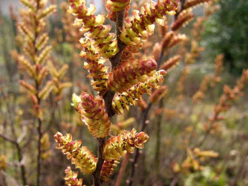 Wunderschön präsentiert sich zur Zeit Myrica gale, der Gagelstrauch. Er kommt in NW-Dt in Sumpf- und Moorgebieten auch wild vor, steht aber als bedrohte Art auf der Roten Liste. Nicht wenige Dichter (vor allem Hermann Löns) haben den blühenden Gagel besungen. Das Bild stammt aus dem eigenen Garten, denn Myrica gale ist auch im Handel.
