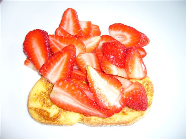 danach gab es:Fotzelschnitten (armer Ritter) mit den ersten Erdbeeren aus dem GartenDas Bild ist ein Aprilscherz, die Erdbberen sind aus Spanien