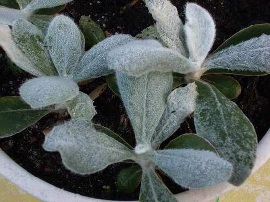 Ich tippe auf Jungpflänzchen vom Silberblattsalbei (S. argentea), der aber den Kübel nicht unbedingt brauchen würde....