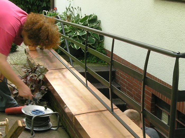 Wir bekommen ein neues Geländer am Kellertreppenschacht, ich habe alle Fugenbegrünung entfernt - fast alle - die prächtige Heuchera zu meucheln habe ich nicht fertig gebracht. Die Handwerker mussten noch mit Schweißgeräten dort arbeiten, dennoch wurde der Pflanze kein Haar gekrümmt