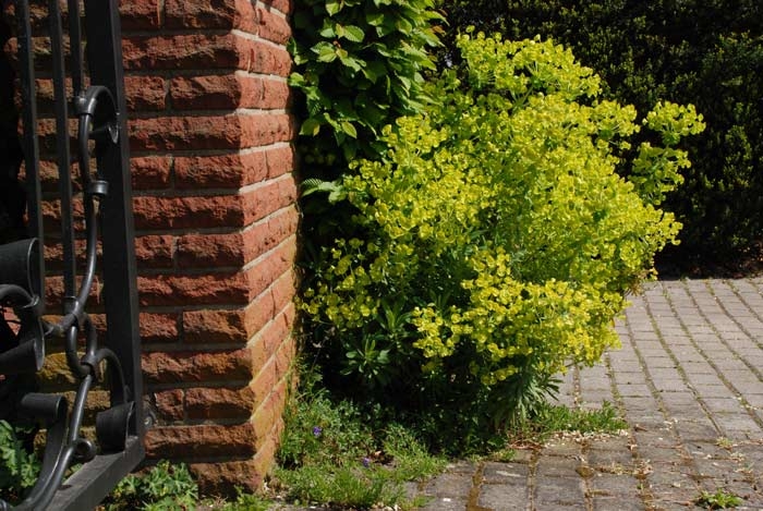 Vor dem zweiten Torpfeiler wächst eine Euphorbia characias, am Boden blüht schon das kleine Glockenblümchen, außerdem gedeiht hier sehr gut Geranium dalmaticum, das zeige ich dann, wenn es blüht.