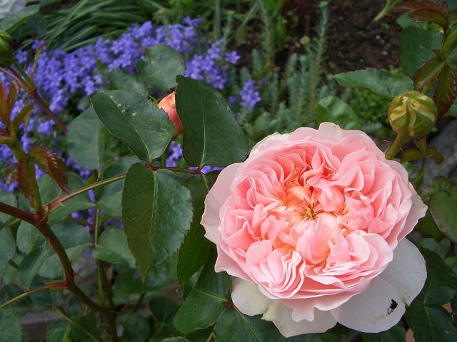 Penelope, ebenfalls mit einer feinen Farbe, dazu der feine sanfte Duft.Noch muss man sich bücken um an ihr zu schnuppern, da sie wächst erst mal in die Breite wächst, mit vielen verzweigten Blütenästen. Auch sie steht im zweiten Jahr und ist jetzt etwa 80 cm hoch.Daneben am Winterschneeball wächst eine blaue unbekannte Clematis, die sich später am Rosenbogen mit Penelope zusammen einen herrlichen Kontrast bilden wird.