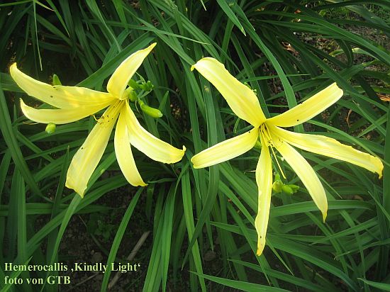 Da der Thread Taglilien - 2007 zu 95% mit möglichst runden Blüten beschickt wird, eröffne ich hier nun einen zweiten Thread für Blüten mit schmalen Segmenten, was heißt, dass die oberen drei Blütenblätter so schmal sind, dass man gut die drei unteren bis fast zum Ansatz am Blütenboden sehen kann.Da bei mir die Taglilienblüte gerade erst an diesem Wochenende begonnen hat, eröffne ich den Thread mit einem Foto von 'Kindly Light' (Bechthold 1949), gewissermaßen der Urmutter aller Spider, die auch heute noch eingekreuzt wird, weil sie mit die schmalsten Blütensegmente bei Taglilien überhaupt hat. Außerdem ist sie einziehend und absolut winterhart.Nach mehrtägiger Abwesenheit begrüßten mich heute abend diese zwei Blüten.