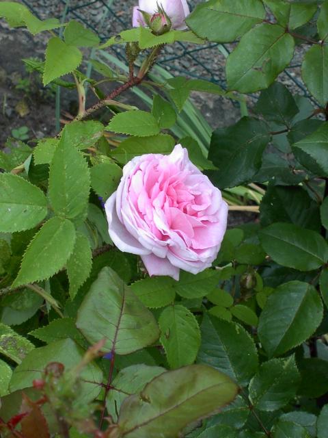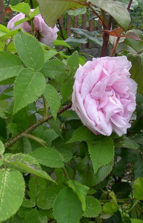 SdM,ist es auf keinen Fall.Mmm E O,ist heller lockerer gefüllt und wächst aufrecht mit starken Stacheln.Wenn man annimmt,daß die Farbe des Fotos zu kräftig ist,hat man auch die hellen Blätter der Albarosen,die Blattform und die Zacken würden passen,die Blütenform ebenfalls.Centifolie ist es keine,die haben rund Blätter und die Blütenform passt nicht.Für mich ist es Maidens Blush. Rosi!