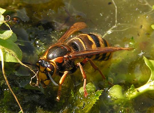 ..springe mal mit den verschiedenen Arten etwas hin- und her. Vielleicht wird es dann etwas interessanter und nicht ganz so subtil.Mal ein Bild einer Feldwespe (aus der Familie der Faltenwespen)Das sind nicht die Teile, die uns bei der Schwarzwälderkirschtorte, oder zuckerhaltigen Getränken (Cola, Fanta...) nerven, sondern sehr zurückhaltende und scheue Wesen. Auch Kinder brauchen vor ihnen keine Angst haben.Der Rücken kann mitunter etwas unterschiedlich gezeichnet sein - nicht aber der Hinterleib - dann handelt es sich um eine andere Unterart.Weitere Bilder hier: klick