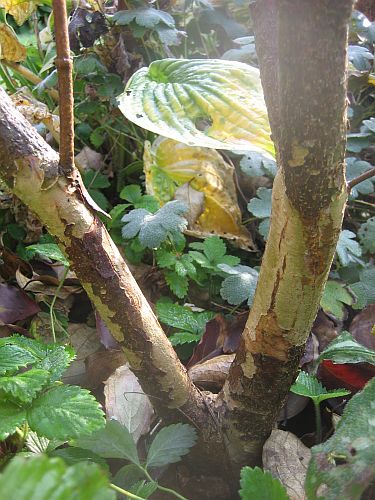 Seit vier Jahren hege und pflege ich einen Cornus kousa var. chinensis. Dieses Jahr hat er prächtig geblüht, aber leider immer noch keine Früchte gebracht. Nun fiel mir auf, dass die Spitzen des Laubs vor ein paar Wochen zu trocknen begannen. Zunächst dachte ich an Herbsterscheinungen, da auch andere Gehölze sich sehr früh verfärbten.Dann aber trockneten die Blätter nur ohne Herbstfarbe anzunehmen.Als Susanne da war, bemerkte sie, dass unten am Stamm die Rinde weitgehend fehlte. Gestern hörte ich, dass Wanderratten gern Baumrinde in ihrer Köperhöhe abnagen. Ist das so?Und vor allem, wird der Baum noch zu retten sein? Gegebenenfalls wie? Er ist inzwischen 2,50m hoch.
