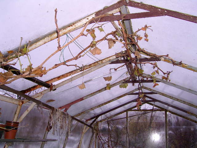 Habe mal versucht, ein Foto von meinem Weinstock im Glashaus zu machen - viel erkennen kann man zwar nicht, ich habe aber schon gemerkt, daß ich 2 lange Haupttriebe stehen gelassen habe. Da werde ich mich wohl von einem trennen müssen.Ein bißchen Zeit ist ja noch, obwohl ich schon bissl ausgelichtet habe.Die Nachbarschaft mit Tomaten und Gurken sollte nicht hinderlich sein!?