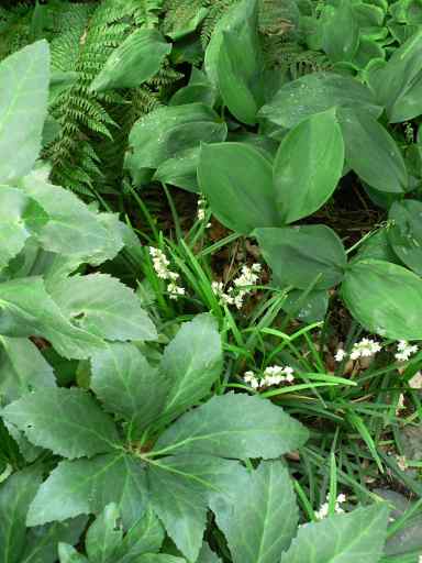 Jetzt noch gruene, dichte Rosetten, Durchmesser < 30cm, duenne Wurzeln an einem stabilen holzigen Grundstock, Am auffaelligsten: die Rossettte "liegt flach", es sieht aus, als haette jemand den ganzen Bestand plattgedrueckt.Beim Schenker stehen die Pflanzen in aufgefuelltem Mutterboden, sehr schattig. Sie bestocken sich recht stark. Sie sollen auch bluehen, mit "niedlichen, zarten" Blueten.Hat hiervon wer schon eine Idee?Ich mach noch ein Photo und vermesse weiter.