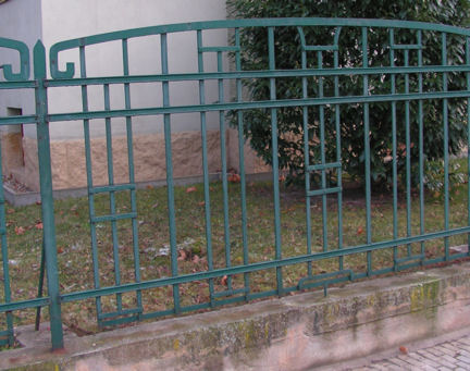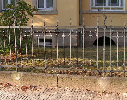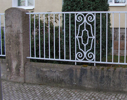 Heut auf dem Weg in den Garten hab ich einige Zäune geknipst. Entstanden sind sie allesamt in der Gründerzeit bis späte 30er Jahre. Weltbewegendes ist nicht dabei, aber der Formenreichtum ist unübersehbar. Ich möchte mich auch auf diese Zeitspanne beschränken, da die spätere Zeit nicht allzuviel erfreuliches zu bieten hat. Zu Anfang dieses niedrige Exemplar. Zur Jahrhundertwende wurde es oft in öffentlichen Grünanlagen verwendet. Auch das Kleinpflaster vor dem Zaun stammt noch aus der Entstehungszeit!