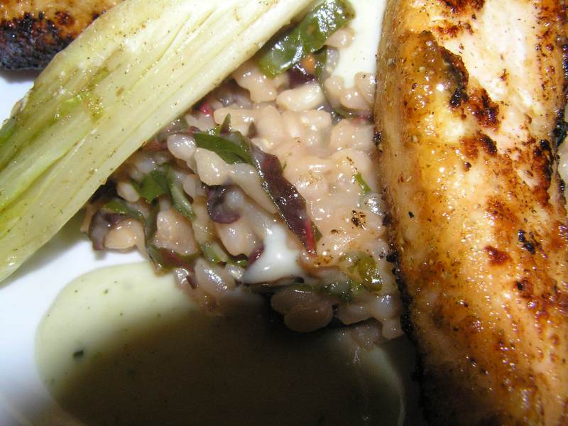 es gab:risotto mit bunten mangoldstreifen, dazu mehlierte lachsfilets, gebratene chicoreeviertel und ein wasabisößchen.dazu noch was...eigentlich sollte es risotto nero, also schwarzes risotto mit sepiatinte geben.ich hatte hier bei den gewürzen noch ein kleines fläschen (in der form eines fisches mit schwarzer flüssigkeit drin) stehen. ich war mir sicher, daß das sepiatinte ist! kippe es also fröhlich ins risotto und wunder mich, warum es nicht schwarz wird...dann wurde mir klar, daß das sojasoße vom sushi-essen war...