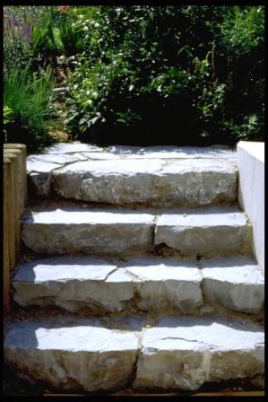 ... das war eine einfache Nebentreppe zur Sauna - fügt sich gut ins Gelände ein - aber nix für Winter und als Hauptweg... noch ein Bild:Naturstein-Block-Stufe mit Granitpflaster