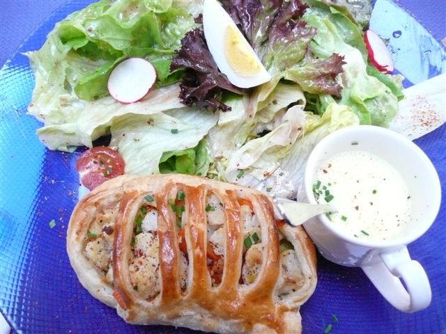 heute habe ich mir Menu 2 bestellt:Gemüsestrudel mit Blattsalat, zum Strudel gab es eine feine warme Kräutersauce