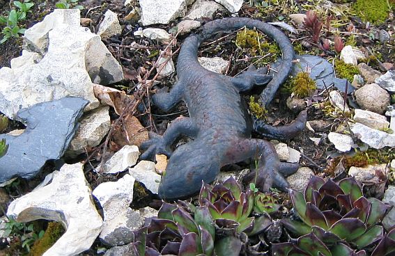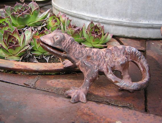 Ein weiteres sehr schönes Beispiel für Gartenzwerge auf 4 Beinen ist diese salamanderfette Eidechse. Ich habe sie mir selbst gekauft. wahrscheinlich an einem verregneten Tag, als ich in der Buchhandlung kein erschwingliches Gartenbuch finden konnte.Sie rostet nun bereits seit 5 Jahren.