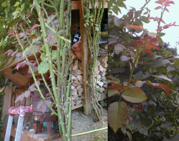 , die Langtriebe. Die Rose steht an einem Pfosten unseres Brennholz-Gartengeräte-etc.-Schuppens und teilt sich dessen Dach mit Bobby James und Dortmund. Der Neuaustrieb im rechten Bilddrittel nach dem Schnitt der verblühten Dolden ist auffallend rötlich-orange. Hübsch.Fotos von heute 18 Uhr.