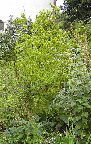 Wieso kann ich denn das Bild nicht nachträglich dazufügen? *zudummbin?*Dann ebend so: Der Stamm ist ganz links, das hellgrüne Laub gehört zur Kornelkirsche.