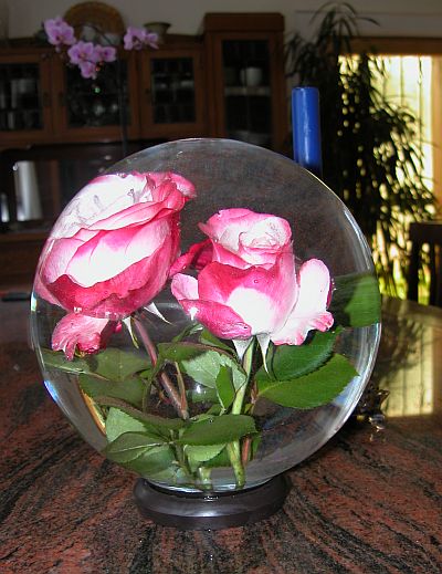 SOOO alt bin ich nun auch nicht! ;DDie Glaskugel wird mit Wasser gefüllt, die Blumen in den Gummiboden gesteckt und am besten unter Wasser verschlossen- damit keine Luftblasen entstehen. So hält das Gesteck 3-4 Wochen.