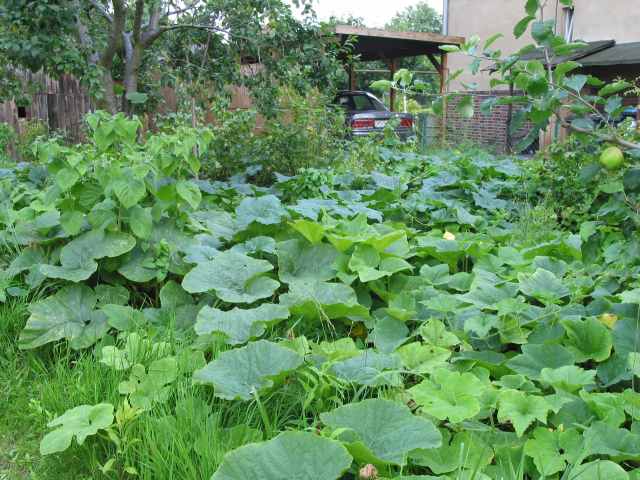 Schmerzlich vermißt wird bisher noch der Muskatkürbis und ein anderer großer grau/blauer. Ich hoffe, daß sie sich nur verstecken...Auf dem Bild links hinten ist etwas von einem Pflaumenbaum zu sehen. Davor steht eine Andenbeere (Physalis). Daneben viele Kürbisranken, irgendwo darunter/dazwischen Johannisbeerbüsche. Fotos von Kürbissen später. (Hoffentlich.)
