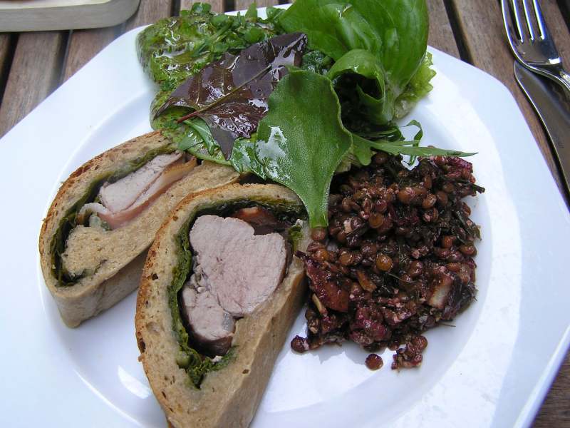 hier gabs knuspers schweinefilet im brotteig, dazu gartensalat und einen linsensalat mit gedünsteten rote bete blättern, gerösteten kartoffelwürfeln und schafskäse.