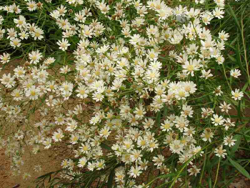 Die Aster umbellatus 'Weißer Schirm' steht dagegen straff aufrecht, die Blüten befinden sich etwa in Augenhöhe.