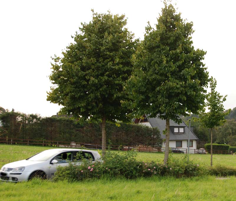 Die Bäume stehen bei uns nicht beengt, es ist zwar der Eingang zu einer Siedlung, diese beginnt allerdings zunächst mit Feldern links und rechts von der Straße.