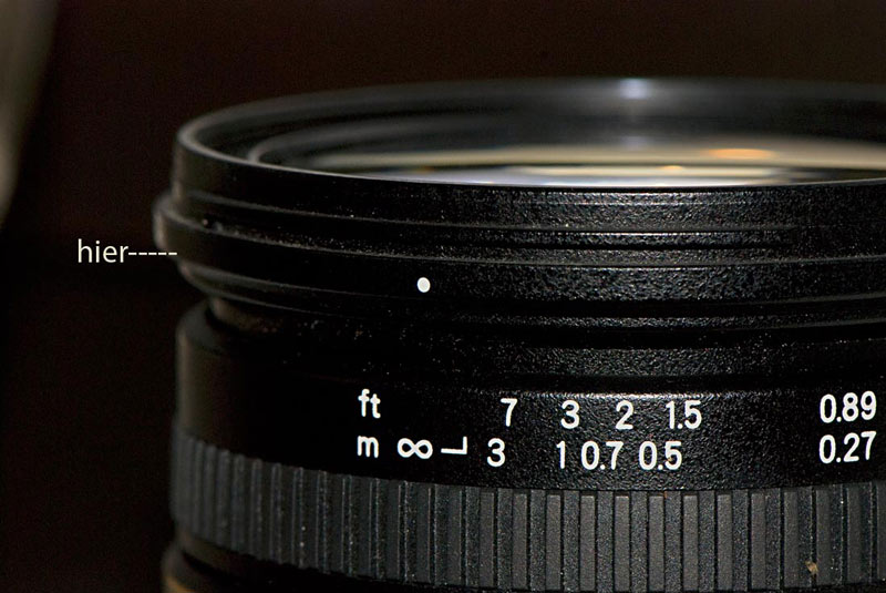 Möchte euch mal zeigen, wo´s dem Patienten fehlt. An der Stelle, an der ich "hier" geschrieben habe, ist etwas locker. Man kann den Ring, an dem die Gegenlichtblende eingeschraubt wird, ca 1-2 Millimeter nach oben bzw. nach unten bewegen. Bewegt man es nach oben, ist zwischen der Frontlinse und dem Bajonett etwas Luft. Schüttelt man das ganze Objektiv, hört man, dass an dieser Stelle etwas locker ist. Mein Mann meint, wenn man einen Tropfen Sekundenkleber reingäbe, wäre der Fall behoben. Ich bin da eher skeptisch