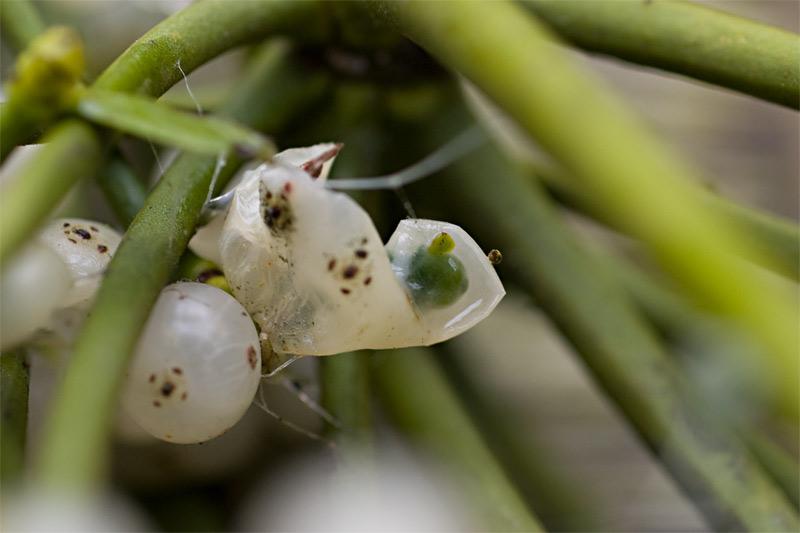 Auf den Mistelzweigen, die ich gestern gekauft habe, habe ich dies entdeckt. Ist es ein Samen, der sich auf den Zweig geklebt hat? Die weißen Fäden sind anscheinend klebrige Halteschnüre.Könnte man mit diesem Samen Misteln auf einem Baum ansiedeln?