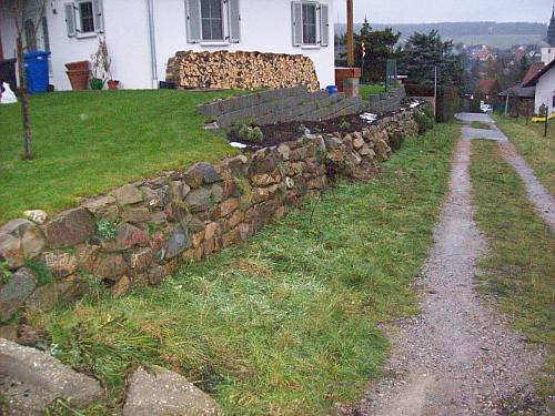 Soweit ich mich erinnern kann, hatten die Arbeiter einen Graben ausgehoben und den mit Schotter aufgefüllt, daruf begonnen die Trockenmauer zu errichten. Wir wollten damit den Hang abstützen, da zur Ostseite und Nordseite des Grundstückes Hang war.Die Nordseite wurde mit L - Steine abgestützt, da gibts wohl keine Probleme. An die Ostseite wollte ich den Hang mit eben dieser Trockenmauer abstützen. Ich würde mal sagen, nur die letzten 20 - 30 cm sind zusätzlich mit Muttererde aufgeschüttet, der Rest ist gewachsener Boden.