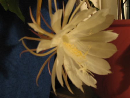 Jedenfalls nehme ich an, daß es eins ist, seine Blattglieder sehen so aus. Ich bekam es von einer alten Dame geschenkt, die behauptete, es sei die Königin der Nacht. Das stimmt aber nicht. Sie hat im Dezember geblüht, eine stark duftende, ca. 20 cm große hell gelbgrüne Blüte mit kleinen Puscheln an den Staubgefäßen. Ein faszinierender Anblick, der mich zwei Tage lang erfreut hat. Leider habe ich kein gutes Foto zustande gebracht.Könnte es ein Epiphyllum laui sein?