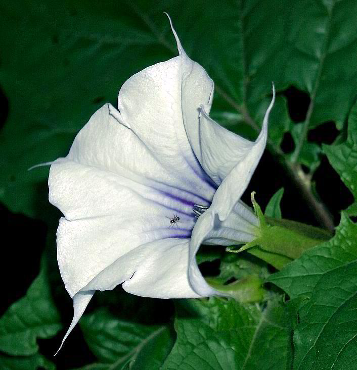 ja Norbert, natürlich hast Du recht. Habe die Fotos nur reingesetzt, weil der Thread "... auch in blau?" heißt. Wollte darum einfach eine blaue Pflanze mal zeigen.Im Garten hatte ich natürlich die einheimischen Pflanzen, der Samen war von der Staudengesellschaft, sie blühten schön weiß, haben mich aber - wie gesagt - wieder verlassen, d.h., der ausgefallene Samen hat nicht gekeimt. Gruss Irm@irmich meine das ist nicht unser einheimischer d. stramonium. ich habe erst vor kurzem in einem garten hier ein einzelnes datura exemplar in einem beet gesehen...weissblütig + sehr große blüte, blütenöffnung senkrecht nach oben...dachte noch...sieht aber komisch aus für eine datura. sah vom blatt her aber auch nicht wie brugmansia aus, aber irgendwie überdimensioniert für datura stram. keine ahnung was das ist...vielleicht eine hybride mit anderne datura arten aus dem mittelmeerraum oder gar mit brugmansia (falls das überhaupt möglich ist). das könnte erklären, weshalb der samen nicht winterhart ist.norbert