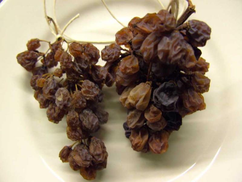 neben der hier ab #108 geschilderten frischhaltung kann man trauben natürlich auch trocknen und erhält schönste, sortenreine rosinen.man darf natürlich nur kerngesunde, lockerbeerige trauben benutzen.meine habe ich an fäden an balken gehängt.meiner meinung nach eignen sich säure-und zuckerreiche trauben am besten.