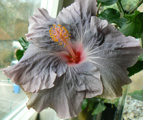 In diesem thread kann jeder die Pflanze oder Blüte posten, die der ganz persönliche Star des Tages ist. Ich beginne mit Tylene, die ja den Glashausbesuchern nicht ganz unbekannt ist.Sie ist eine echte Diva, mäkelig, was Licht und Wärme angeht, und geht sehr ökonomisch mit ihren Reizen um. Im Herbst habe ich sie schon recht früh eingeräumt, weil ich ja weiß, dass ihr kalte Nächte gar nicht gefallen. Es dauerte nicht lange und die Blätter wurden eins nach dem anderen gelb und begannen zu rieseln. Nun ja, dachte ich, sie muss sich erst wieder einfinden. Aber das Geriesele hörte nicht auf: sie hatte aus dem Sommerquartier Spinnmilben mitgebracht. Ziemlich kahl stand sie da, mit nur wenigen Blättern, aber an der Spitze eines Astes trohnte eine kleine Knospe. Die fiel nicht ab. Sie wuchs aber auch nicht. Tylene beschäftigte sich nach erfolgreicher Behandlung mit dem Produzieren von neune Blättern. Die Knospe trohnte weiter da oben. Vor ungefähr anderthalb Monaten begann sie zu wachsen - erst fast unmerklich, dann unübersehbar. Heute hat sie sich entfaltet, nachdem ich erstmal tagelang ihre Außenfarbe bewundern durfte: von lachsigem Rosé zu einem pudrigen Graublau, braun überhaucht. Tusch für Tylene